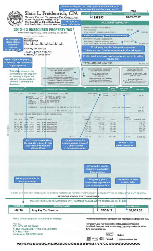 For a detailed overview of your property tax statement, please refer to the sample property tax bill listed below. To navigate the sample property tax bill, move your mouse over the section for a description.
